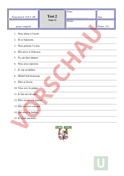Name: Französisch II 3. OS Test 2 Etape 24 passé composé Note: Datum: Punkte: 30 1. Nous allons à lécole. 2. Ils se balancent. 3. Nous prenons lavion. 4. Elle arrive à 10 heures. 5. Tu sais bien chanter. 6. Nous nous reposons. 7. Je vais au théâtre. 8. Michel boit beaucoup. 9. Elles se lèvent. 10. Vous avez la grippe. 11. Je fais mes devoirs. 12. Elles restent à la maison. 13. Elle sort avec son ami. 14. Qui ouvre la fenêtre. 15. Je vends ma moto.
