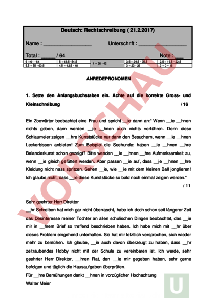 Deutsch: Rechtschreibung 21.2.2017) Name Unterschrift Total 64 6 61 64 5.5 55 60.5 5 48.5 54.5 4.5 42.5 48 Note 4 36 42 3.5 29.5 35.5 3 23 29 2.5 16.5 22.5 2 0 – 16 ANREDEPRONOMEN 1. Setze den Anfangsbuchstaben ein. Achte auf die korrekte Gross und Kleinschreibung 16 Ein Zoowärter beobachtet eine Frau und spricht ie dann an: Wenn ie hnen nichts geben, dann werden ie hnen auch nichts vorführen. Denn diese Schlaumeier zeigen hre Kunststücke nur dann den Besuchern, wenn ie hnen Leckerbissen anbieten! Zum Beispiel die Seehunde: haben ie hnen hre Balancierkunst schon gezeigt? Bitte wenden ie hnen hre Aufmerksamkeit zu, wenn ie gleich gefüttert werden. Aber passen ie auf, dass ie hnen hre Kleidung nicht nass spritzen. Sehen ie, wie ie mit dem kleinen Ball jonglieren! Ich glaube nicht, dass ie diese Kunststücke so bald noch einmal zeigen werden. 11 Sehr geehrter Herr Direktor hr Schreiben hat mich gar nicht überrascht, habe ich doch schon seit längerer Zeit das Desinteresse meiner Tochter an allen schulischen Dingen beobachtet, das ie mir in hrem Brief so treffend beschrieben haben. Ich habe mich mit hr über dieses Problem eingehend unterhalten. Sie hat mir letztlich versprochen, sich wieder mehr zu bemühen. Ich glaube, ie auch davon überzeugt zu haben, dass hr zeitraubendes Hobby nicht mit der Schule zu vereinbaren ist. Ich werde, sehr geehrter Herr Direktor, hren Rat, den ie mir gegeben haben, sehr gerne befolgen und täglich die Hausaufgaben überprüfen. Für hre Bemühungen dankt hnen in vorzüglicher Hochachtung Walter Meier /5 DAS DASS 1. Setze das oder dass ein 15 . ist . Fest, . man auf keinen Fall verpassen sollte. Ich glaube, . . . Fest des Jahrhunderts werden könnte. Man hört, . zahlreiche bekannte Künstler auftreten werden. Ausserdem wird gemunkelt, . fünfköpfige Artistenensemble aus Genf werde auftreten. . wird sicher Anlass zum Staunen geben. Ich hoffe, . . chinesische Restaurant, . die besten Frühlingsrollen macht, auch einen Stand hat. Es ist sowieso toll, . es so viel gutes Essen geben wird. . . Karussell mit dem weissen Pferd wieder da ist, . hofft mein kleiner Bruder. Er sagt, . er mindestens dreimal damit fahren werde. . Taschengeld, . er kriegt, wird dafür aber nicht reichen. Doch . vermag seine Euphorie nicht zu bremsen und ich finde, . ist gut so. Fast hätte ich vergessen, . es eine Disco geben wird, . eine Bühne für Konzerte aufgebaut wird und . . ganze Schulhaus, . normalerweise ein grauer Betonklotz ist, eine farbige Dekoration erhält. . alles nach einem Wochenende schon wieder vorbei ist, . ist . Einzige, . ich an diesem Fest auszusetzen habe. 2. Streiche im folgenden Text alle das/dassFehler an /4 Gestern spielten wir in Zürich ein Tennisdoppel. Es war ein toller Zeitvertreib! Die Sonne brannte dermassen heiss auf uns herunter, das wir sehr schwitzten. Aber dass war uns ziemlich egal. Mein Partner schoss die Bälle so scharf, dass sie unseren Gegnern nur so um die Ohren flogen. Ausserdem war er am Netz so gut, das es eine Lust war, ihm zuzusehen. Wir amüsierten uns gut und merkten nicht, das die Zeit verging. 6:2, 6:4 war ein Ergebnis, dass wir nicht erwartet hatten. Es war das gut harmonierende Zusammenspiel zwischen mir und meinem Partner, dass uns diesen Erfolg gebracht hatte. KONSONANT ODER DOPPELKONSONANT? /6 1. Die Äpfel sind noch nicht rei 2. Das war ein tolles Erlebni 3. Ich bin nicht mit ihm verwa dt. 4. Er ste te die Flasche auf den Tisch. 5. Er gri zu einem ungewöhnlichen Mittel. 6. Er na te keine Namen 7. Seine Sti klang heiser. 8. Die Diebe stah en wertvollen Schmuck aus dem Tresorraum. 9. Betreten des Ra ens verboten. 10. Er ist für zehn Tage verrei t. 11. Er suchte im Werkzeugkasten nach einem Ha er. 12. Er bah te sich einen Weg durch die Menge. 1. Ergänze die Tabelle, in dem du ein ähnlich klingendes Wort einfüllst /3 Nimm ein Beispiel und erkläre den Bedeutungsunterschied /1 Beispiel: vs. KORREKTE RECHTSCHREIBUNG 1. Korrigiere alle Wörter, die großgeschrieben werden 12 Jeder Satz hat einen Schreibfehler drin. Schreibe das korrekte Wort auf die Linie (pro Fehler – 0.5) 1. vor dem verzehr von gift pilzen wird dringend gewarnt. Korrigierter Fehler: 2. ich nehme dieses kuchen stück mit streuseln und dazu eine tasse tee. Korrigierter Fehler: 3. gemäss wetter bericht gibt es morgen wieder heftigen regen. Korrigierter Fehler: 4. gibst du mir bitte ein blatt papier damit ich einen scheren schnitt machen kann? Korrigierter Fehler: 5. beim pokern zählen gute nerven, kalt blütigkeit und glück. Korrigierter Fehler: 6. sie hatten als verteidigung nur aus flüchte und lügen vorzubringen. Korrigierter Fehler: 2. Unterstreiche die Fehler Der Landwird verläst sich föllig auf die Wetterprognohse. Diese klegliche Niderlage muss dir nicht peindlich sein. Die Ärtztin hat die Praxis gemühtlich eingerichtet. Dieses Produkt hat überhaubt keine Forteile. Die Hemden wurden halbwex sorgfälltig angevertigt. /7