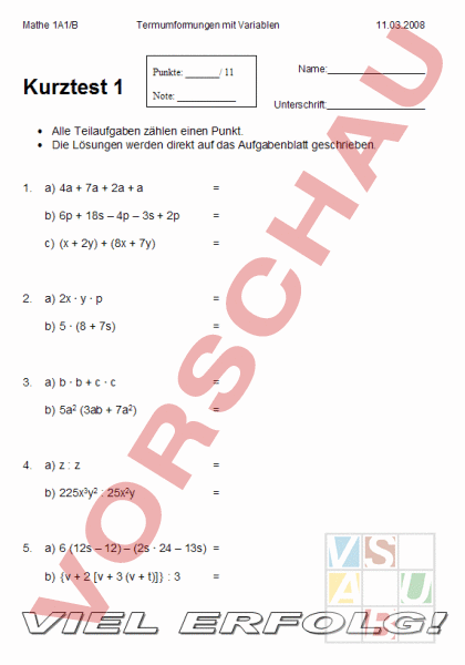 Kurztests zur Termumformung. Aufgaben aufgeteilt nach verschiedenen Problemstellungen und Rechenregeln.