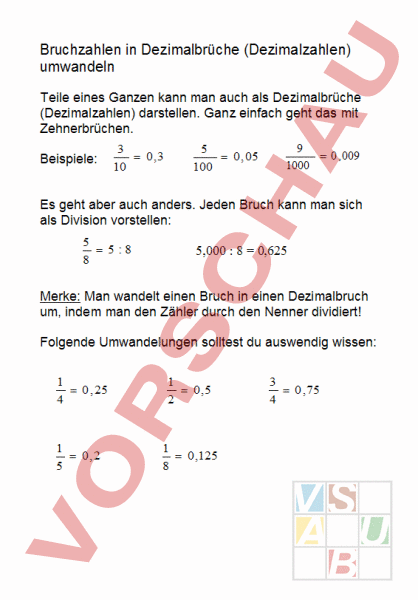 Bruchzahlen in Dezimalbrüche (Dezimalzahlen) umwandeln Teile eines Ganzen kann man auch als Dezimalbrüche (Dezimalzahlen) darstellen. Ganz einfach geht das mit Zehnerbrüchen. Beispiele: 3 0 ,3 10 5 0 05 100 9 0 009 1000 Es geht aber auch anders. Jeden Bruch kann man sich als Division vorstellen: 5 5 :8 8 5,000 8 0,625 Merke: Man wandelt einen Bruch in einen Dezimalbruch um, indem man den Zähler durch den Nenner dividiert! Folgende Umwandelungen solltest du auswendig wissen: 1 0 25 4 1 0 ,2 5 1 0 ,5 2 1 0 ,125 8 3 0 75 4