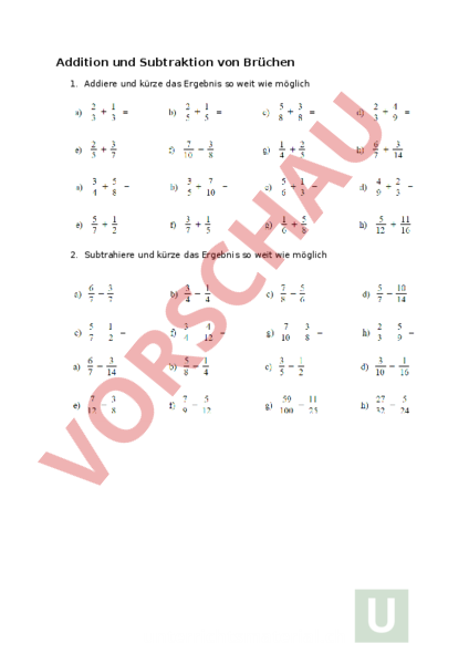 Addition und Subtraktion von Brüchen 1. Addiere und kürze das Ergebnis so weit wie möglich 2. Subtrahiere und kürze das Ergebnis so weit wie möglich Addition und Subtraktion von Brüchen (Lösungen) 1. Addiere und kürze das Ergebnis so weit wie möglich 2. Subtrahiere und kürze das Ergebnis so weit wie möglich