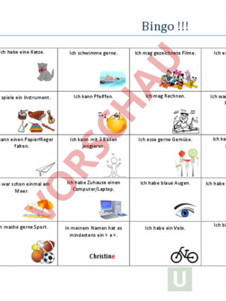 Bingo !!! Ich habe eine Katze. Ich schwimme gerne. Ich mag gezeichnete Filme. Ich esse gerne Fisch. Ich kann „Alle meine Entchen singen. Ich spiele ein Instrument. Ich kann Pfeiffen. Ich mag Rechnen. Ich war schon einmal in Frankreich. Ich schaue jeden Tag Fernsehen. Ich kann einen Papierflieger falten. Ich kann mit 3 Bällen jongieren. Ich esse gerne Gemüse. Ich kann nur ein Auge schliessen. Ich habe einen Hund. Ich war schon einmal am Meer. Ich habe Zuhause einen Computer/Laptop. Ich habe blaue Augen. Ich habe ein eigenes Handy. Ich esse gerne Pizza. Ich mache gerne Sport. In meinem Namen hat es mindestens ein « ». Ich habe ein Velo. Ich bin schon einmal geflogen. Ich kann mit der Zunge meine Nase berühren. Christine