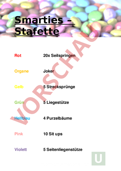 Smarties – Stafette Rot 20x Seilspringen Organe Joker Gelb 5 Strecksprünge Grün 5 Liegestütze Hellblau 4 Purzelbäume Pink 10 Sit ups Violett 5 Seitenliegenstütze Braun 10 Sekunden Hocke