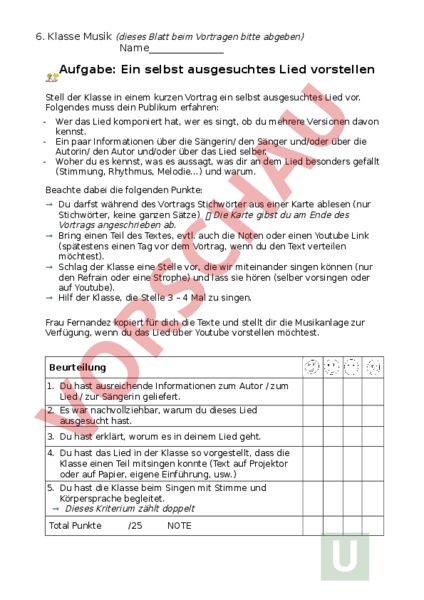 Auftrag zur Präsentation und Einführung eines selbst ausgesuchten Liedes, inkl. Bewertugnsraster