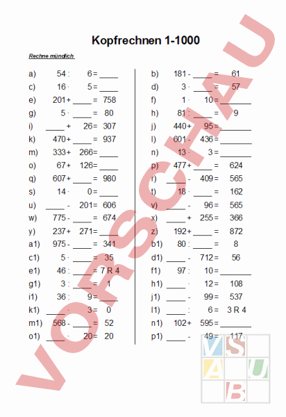 Arbeitsblatt: Kopfrechnen (+Lösungen)
