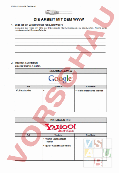 Wahlfach Informatik: Das Internet DIE ARBEIT MIT DEM WWW 1. Was ist ein Webbrowser resp. Browser? Versuche die Frage mit Hilfe der Internetseite zu beantworten. Nenne auch mindestens drei Browser-Beispiel. 2. Internet-Suchhilfen Ergänze folgende Tabellen. SUCHMASCHINEN Art Volltextsuche Vorteile • Nachteile • viele irrelevante Treffer WEB-KATALOGE Art Vorteile • wenig unpassende Treffer Nachteile • • guter Gesamtüberblick 1 Wahlfach Informatik: Das Internet META-SUCHMASCHINEN Art Meta TopErgebnisse Vorteile • Nachteile • Aufgaben: In welchen Situationen benutzt du welche Suchhilfe? Begründe deine Antworten. Zusatz: Besuche im Netz die Seite www.metager.de und informiere dich über deren Möglichkeiten. 3. Internetsuche Lies die Strategien durch und probiere sie im Internet aus. 1. Suchwort in Kleinbuchstaben: Es wird in der Regel nicht zwischen Gross- und Kleinschreibung unterschieden. 2. Phrasen in Anführungszeichen: Der einfachste Trick zum Eingrenzen: Was du innerhalb von zwei Anführungszeichen eingibst, wird bei den meisten Suchmaschinen als untrennbare Einheit gesucht. Eingabe „Johann Nepomuk Schmidt hat gegenüber einer Suche mit Johann Nepomuk Schmidt viele Vorteile. 3. Verknüpfung mit ODER OR: Alle Dokumente, die mindestens einen der Begriffe enthalten, werden aufgelistet. Dokumente, auf denen mehrere der Suchbegriffe auftauchen, stehen in der Regel zuoberst in der Liste. EINGABE: Hund OR Katze OR Maus 4. Verknüpfung mit UND AND: Sollen mehrere Wörter zusammen und unbedingt in einem Dokument vorkommen, so kannst du sie mit „und resp. „and verknüpfen. Komfortabler ist die Abkürzung mit dem Pluszeichen, welches direkt vor dem Begriff (ohne Leerzeichen) gesetzt wird. Eingabe: Hund Katze Katze (Maus) 5. Verknüpfung mit UND NICHT: Möchtest du bei einer Anfrage, beispielsweise zu einer französischen Stadt, eine grosse Zahl zu erwartender Antworten ausblenden, so kannst du sie mit „und nicht resp. „and not verknüpfen. Komfortabler ist die Abkürzung mit dem Minuszeichen, welches direkt vor dem Begriff (ohne Leerzeichen) gesetzt wird. Eingabe: Bordeaux –Wein 2 Wahlfach Informatik: Das Internet 6. Wildcarts/Platzhalter: Die Eingabe auto* liefert dir auch Dokumente, in denen Automobil, Automatik, Autorenhonorar usw. vorkommt. 4. Was habe ich gelernt? Was hasst du heute Neues gelernt? 3