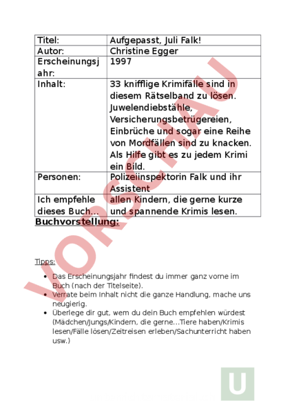 Titel: Autor: Erscheinungsj ahr: Inhalt: Aufgepasst, Juli Falk! Christine Egger 1997 33 knifflige Krimifälle sind in diesem Rätselband zu lösen. Juwelendiebstähle, Versicherungsbetrügereien, Einbrüche und sogar eine Reihe von Mordfällen sind zu knacken. Als Hilfe gibt es zu jedem Krimi ein Bild. Personen: Polizeiinspektorin Falk und ihr Assistent Ich empfehle allen Kindern, die gerne kurze dieses Buch und spannende Krimis lesen. Buchvorstellung: Tipps: Das Erscheinungsjahr findest du immer ganz vorne im Buch (nach der Titelseite). Verrate beim Inhalt nicht die ganze Handlung, mache uns neugierig. Überlege dir gut, wem du dein Buch empfehlen würdest (Mädchen/Jungs/Kindern, die gerneTiere haben/Krimis lesen/Fälle lösen/Zeitreisen erleben/Sachunterricht haben usw.) Titel: Autor: Erscheinungsj ahr: Inhalt: Personen: Ich empfehle dieses Buch