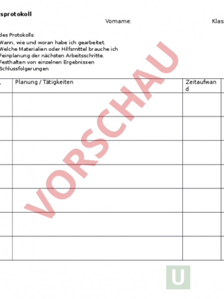 Arbeitsprotokoll Name: Zweck Vorname: Klasse: des Protokolls: Wann, wie und woran habe ich gearbeitet. Welche Materialien oder Hilfsmittel brauche ich Feinplanung der nächsten Arbeitsschritte. Festhalten von einzelnen Ergebnissen Schlussfolgerungen Datum, Zeit Planung Tätigkeiten Zeitaufwan Reflexion Erkenntnisse Schlussfolgerungen