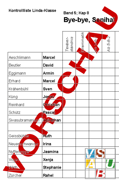 Kontrollliste Linda-Klasse Band 5; Kap 8 Aeschlimann Marcel Beutler David Eggimann Armin Erhard Marcel Krähenbühl Sven Küng Jonas Reinhard Christian Schütz Pascal Sivasubramaniam Apirathan Geissbühler Ruth Neuenschwander Irina Nyffenegger Jasmina Vögeli Xenja Wirth Stephanie Zürcher Rahel Test 5-8 Test 5-8 Lernzielkontrolle 58 Ab 5-8-7 Ab 5-8-6 Ab 5-8-5 Ab 5-8-4 Ab 5-8-3 Ab 5-8-2 Ab 5-8-1 Grammatik Textverständnis Bye-bye, Seniha!