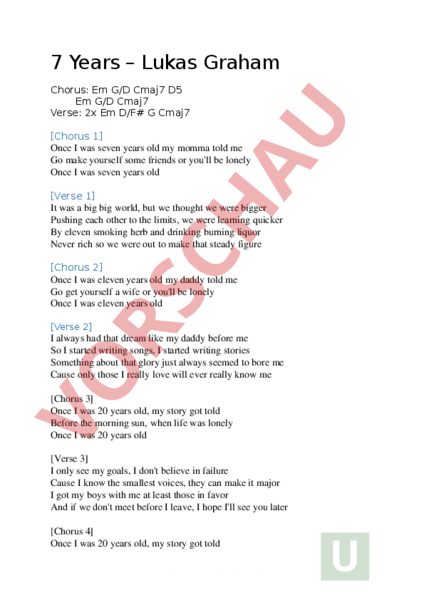 7 Years – Lukas Graham Chorus: Em G/D Cmaj7 D5 Em G/D Cmaj7 Verse: 2x Em D/F# Cmaj7 [Chorus 1] Once was seven years old my momma told me Go make yourself some friends or youll be lonely Once was seven years old [Verse 1] It was big big world, but we thought we were bigger Pushing each other to the limits, we were learning quicker By eleven smoking herb and drinking burning liquor Never rich so we were out to make that steady figure [Chorus 2] Once was eleven years old my daddy told me Go get yourself wife or youll be lonely Once was eleven years old [Verse 2] always had that dream like my daddy before me So started writing songs, started writing stories Something about that glory just always seemed to bore me Cause only those really love will ever really know me [Chorus 3] Once was 20 years old, my story got told Before the morning sun, when life was lonely Once was 20 years old [Verse 3] only see my goals, dont believe in failure Cause know the smallest voices, they can make it major got my boys with me at least those in favor And if we dont meet before leave, hope Ill see you later [Chorus 4] Once was 20 years old, my story got told was writing about everything, saw before me Once was 20 years old Soon well be 30 years old, our songs have been sold Weve traveled around the world and were still roaming Soon well be 30 years old [Verse 4] Im still learning about life My woman brought children for me So can sing them all my songs And can tell them stories Most of my boys are with me Some are still out seeking glory And some had to leave behind My brother Im still sorry [Bridge] Soon Ill be 60 years old, my daddy got 61 Remember life and then your life becomes better one made man so happy when wrote letter once hope my children come and visit, once or twice month [Chorus 5] Soon Ill be 60 years old, will think the world is cold Or will have lot of children who can warm me Soon Ill be 60 years old Soon Ill be 60 years old, will think the world is cold Or will have lot of children who can hold me Soon Ill be 60 years old [Chorus 1 recap] Once was seven years old, my momma told me Go make yourself some friends or youll be lonely Once was seven years old Once was seven years old
