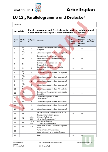 Arbeitsblatt: Arbeitsplan Mathbuch 1 LU 12