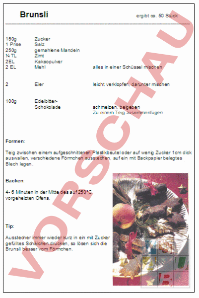 Brunsli ergibt ca. 50 Stück 150g 1 Prise 250g TL 2EL 2 EL Zucker Salz gemahlene Mandeln Zimt Kakaopulver Mehl alles in einer Schüssel mischen 2 Eier leicht verklopfen, darunter mischen 100g EdelbitterSchokolade schmelzen, beigeben Zu einem Teig zusammenfügen Formen: Teig zwischen einem aufgeschnittenen Plastikbeutel oder auf wenig Zucker 1cm dick auswallen, verschiedene Förmchen ausstechen, auf ein mit Backpapier belegtes Blech legen. Backen: 4- 6 Minuten in der Mitte des auf 250C vorgeheizten Ofens. Tip: Ausstecher immer wieder kurz in ein mit Zucker gefülltes Schälchen drücken, so lösen sich die Brunsli besser vom Förmchen.