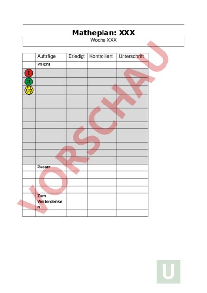 Matheplan: XXX Woche XXX Aufträge Pflicht Zusatz Zum Weiterdenke Erledigt Kontrolliert Unterschrift