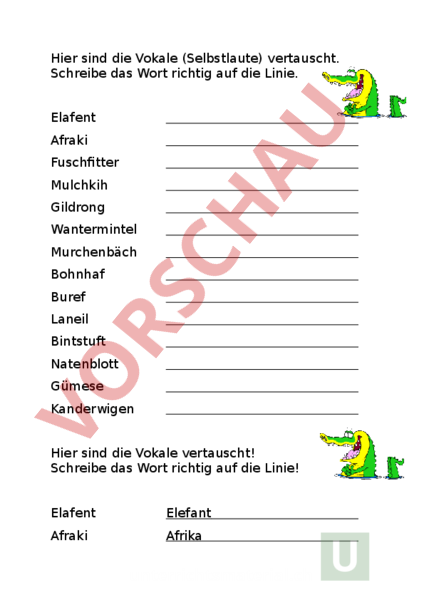 Hier sind die Vokale (Selbstlaute) vertauscht. Schreibe das Wort richtig auf die Linie. Elafent Afraki Fuschfitter Mulchkih Gildrong Wantermintel Murchenbäch Bohnhaf Buref Laneil Bintstuft Natenblott Gümese Kanderwigen Hier sind die Vokale vertauscht! Schreibe das Wort richtig auf die Linie! Elafent Elefant Afraki Afrika Fuschfitter Fischfutter Mulchkih Milchkuh Gildrong Goldring Wantermintel Wintermantel Murchenbäch Märchenbuch Bohnhaf Bahnhof Buref Beruf Laneil Lineal Bintstuft Buntstift Natenblott Notenblatt Gümese Gemüse Kanderwigen Kinderwagen