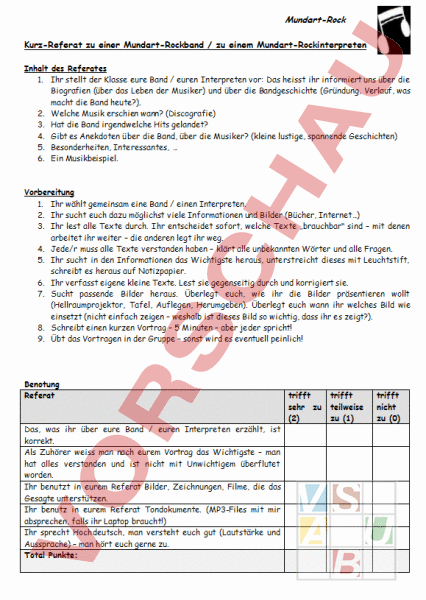 Mundart-Rock Kurz-Referat zu einer Mundart-Rockband zu einem Mundart-Rockinterpreten Inhalt des Referates 1. Ihr stellt der Klasse eure Band euren Interpreten vor: Das heisst ihr informiert uns über die Biografien (über das Leben der Musiker) und über die Bandgeschichte (Gründung, Verlauf, was macht die Band heute?). 2. Welche Musik erschien wann? (Discografie) 3. Hat die Band irgendwelche Hits gelandet? 4. Gibt es Anekdoten über die Band, über die Musiker? (kleine lustige, spannende Geschichten) 5. Besonderheiten, Interessantes, 6. Ein Musikbeispiel. Vorbereitung 1. Ihr wählt gemeinsam eine Band einen Interpreten. 2. Ihr sucht euch dazu möglichst viele Informationen und Bilder (Bücher, Internet) 3. Ihr lest alle Texte durch. Ihr entscheidet sofort, welche Texte „brauchbar sind – mit denen arbeitet ihr weiter – die anderen legt ihr weg. 4. Jede/r muss alle Texte verstanden haben – klärt alle unbekannten Wörter und alle Fragen. 5. Ihr sucht in den Informationen das Wichtigste heraus, unterstreicht dieses mit Leuchtstift, schreibt es heraus auf Notizpapier. 6. Ihr verfasst eigene kleine Texte. Lest sie gegenseitig durch und korrigiert sie. 7. Sucht passende Bilder heraus. Überlegt euch, wie ihr die Bilder präsentieren wollt (Hellraumprojektor, Tafel, Auflegen, Herumgeben). Überlegt euch wann ihr welches Bild wie einsetzt (nicht einfach zeigen – weshalb ist dieses Bild so wichtig, dass ihr es zeigt?). 8. Schreibt einen kurzen Vortrag – 5 Minuten – aber jeder spricht! 9. Übt das Vortragen in der Gruppe – sonst wird es eventuell peinlich! Benotung Referat Das, was ihr über eure Band euren Interpreten erzählt, ist korrekt. Als Zuhörer weiss man nach eurem Vortrag das Wichtigste – man hat alles verstanden und ist nicht mit Unwichtigem überflutet worden. Ihr benutzt in eurem Referat Bilder, Zeichnungen, Filme, die das Gesagte unterstützen. Ihr benutz in eurem Referat Tondokumente. (MP3-Files mit mir absprechen, falls ihr Laptop braucht!) Ihr sprecht Hochdeutsch, man versteht euch gut (Lautstärke und Aussprache) – man hört euch gerne zu. Total Punkte: trifft trifft sehr zu teilweise (2) zu (1) trifft nicht zu (0)