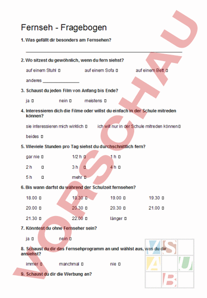 Fernseh Fragebogen 1. Was gefällt dir besonders am Fernsehen? 2. Wo sitzest du gewöhnlich, wenn du fern siehst? auf einem Stuhl auf einem Sofa auf einem Bett anderes 3. Schaust du jeden Film von Anfang bis Ende? ja nein meistens 4. Interessieren dich die Filme oder willst du einfach in der Schule mitreden können? sie interessieren mich wirklich ich will nur in der Schule mitreden können beides 5. Wieviele Stunden pro Tag siehst du durchschnittlich fern? gar nie 1/2 1h 2h 3h 4h 5h mehr 6. Bis wann darfst du während der Schulzeit fernsehen? 18.00 18.30 19.00 19.30 20.00 20.30 20.30 21.00 21.30 22.00 länger 7. Könntest du ohne Fernseher sein? ja nein 8. Schaust du dir das Fernsehprogramm an und wählst aus, was du dir ansiehst? immer manchmal 9. Schaust du dir die Werbung an? nie immer manchmal nie 10. Glaubst du, was die Leute im Werbefernsehen behaupten? ja manchmal nein 11. Isst du oft vor dem Fernseher? ja nein 12. Besitzt ihr ein Videogerät? ja nein 13. Schaust du dir Brutalos und Horrorfilme an? ja nein 14. Hast du manchmal Alpträume, nachdem du ferngesehen hast? ja nein 15. Kommen dir manchmal die Tränen beim Fernsehen? ja nein als ich klein war 16. Schaust du dir Filme an, die eigentlich für Erwachsene gedacht sind? ja, aber nur, wenn die Eltern dabei sind nein ja, aber nur, wenn die Eltern nicht dabei sind 17. Was siehst du dir am liebsten an? Komödien Western Spielfilme Krimis Talkshows Kinderfilme Theaterstücke Sport Trickfilme Liebesfilme Quizsendungen andere_ 18. Was ist deine liebste Freizeitbeschäftigung ohne Fernsehen? 19. Findest du, dass Fernsehen süchtig macht? ja nein 20. Gibt es Streit um die Programmwahl in deiner Familie? ja nein manchmal 21. Diskutiert ihr zuhause über gesehene Sendungen ja nein manchmal 22. Welche Sendungen verbieten dir deine Eltern? Krimis Gruselfilme Tagesschau Western Liebesfilme andere 23. Hast du schon unerlaubterweise ferngesehen? ja nein 24. Hättest du ohne Fernseher mehr Zeit für deine Hobbies? ja nein 25. Was hältst du von diesem Satz: Fernsehen macht die Augen kaputt.? stimmt stimmt nicht weiss nicht