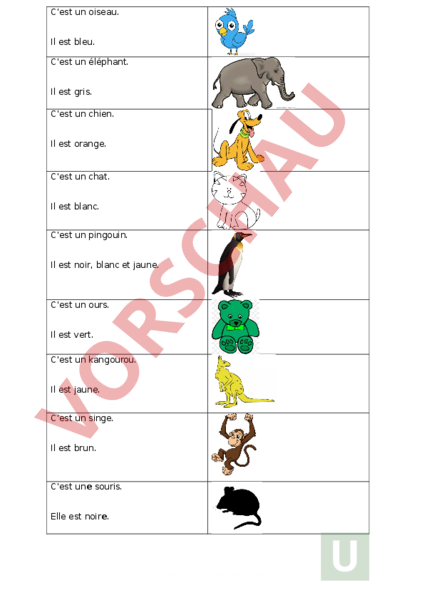 Cest un oiseau. Il est bleu. Cest un éléphant. Il est gris. Cest un chien. Il est orange. Cest un chat. Il est blanc. Cest un pingouin. Il est noir, blanc et jaune. Cest un ours. Il est vert. Cest un kangourou. Il est jaune. Cest un singe. Il est brun. Cest une souris. Elle est noire.