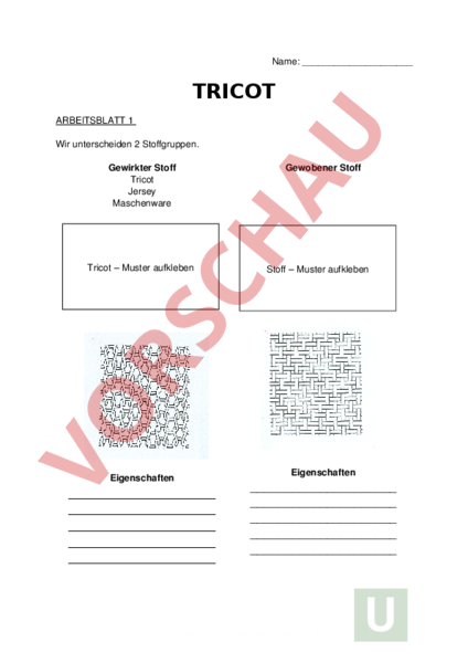 Name: TRICOT ARBEITSBLATT 1 Wir unterscheiden 2 Stoffgruppen. Gewirkter Stoff Tricot Jersey Maschenware Tricot – Muster aufkleben Eigenschaften Gewobener Stoff Stoff – Muster aufkleben Eigenschaften
