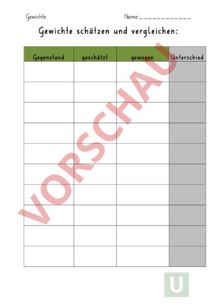 Gewichte Name: Gewichte schätzen und vergleichen: Gegenstand geschätzt gewogen Unterschied