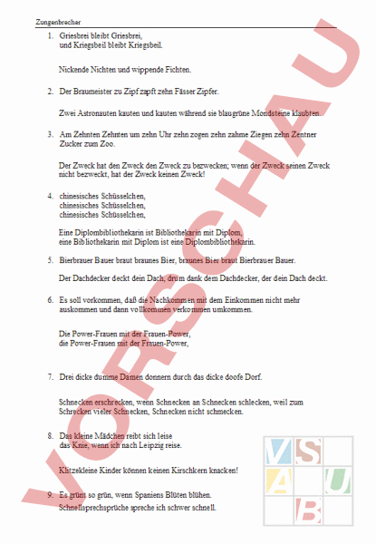 Zungenbrecher 1. Griesbrei bleibt Griesbrei, und Kriegsbeil bleibt Kriegsbeil. Nickende Nichten und wippende Fichten. 2. Der Braumeister zu Zipf zapft zehn Fässer Zipfer. Zwei Astronauten kauten und kauten während sie blaugrüne Mondsteine klaubten. 3. Am Zehnten Zehnten um zehn Uhr zehn zogen zehn zahme Ziegen zehn Zentner Zucker zum Zoo. Der Zweck hat den Zweck den Zweck zu bezwecken; wenn der Zweck seinen Zweck nicht bezweckt, hat der Zweck keinen Zweck! 4. chinesisches Schüsselchen, chinesisches Schüsselchen, chinesisches Schüsselchen, Eine Diplombibliothekarin ist Bibliothekarin mit Diplom, eine Bibliothekarin mit Diplom ist eine Diplombibliothekarin. 5. Bierbrauer Bauer braut braunes Bier, braunes Bier braut Bierbrauer Bauer. Der Dachdecker deckt dein Dach, drum dank dem Dachdecker, der dein Dach deckt. 6. Es soll vorkommen, daß die Nachkommen mit dem Einkommen nicht mehr auskommen und dann vollkommen verkommen umkommen. Die Power-Frauen mit der Frauen-Power, die Power-Frauen mit der Frauen-Power, 7. Drei dicke dumme Damen donnern durch das dicke doofe Dorf. Schnecken erschrecken, wenn Schnecken an Schnecken schlecken, weil zum Schrecken vieler Schnecken, Schnecken nicht schmecken. 8. Das kleine Mädchen reibt sich leise das Knie, wenn ich nach Leipzig reise. Klitzekleine Kinder können keinen Kirschkern knacken! 9. Es grünt so grün, wenn Spaniens Blüten blühen. Schnellsprechsprüche spreche ich schwer schnell. Zungenbrecher 10. Der Kaplan Klapp plant ein klappbares Pappplakat. Zwischen zwei Zwetschgenzweigen sitzen zwei zechenschwarze tschechisch zwitschernde Zwergschwalben. 11. Blaukraut bleibt Blaukraut, Brautkleid bleibt Brautkleid. Das Kind, das so laut geplärrt hatte, saß auf einer heißen Herdplatte. 12. Max wachst Wachsmasken. Was wachst Max? Wachsmasken wachst Max. Klaus Knopf liebt Knödel, Klöße, Klöpse. Knödel, Klöße, Klöpse liebt Klaus Knopf. 13. Kleine Kinder können keine kleinen Kirschkerne knacken. Kleine Kirschkerne können kleine Kinder keine knacken. Mischwasserfischer heißen Mischwasserfischer, weil Mischwasserfischer im Mischwasser Mischwasserfische fischen. 14. Hinterm hohen Haus hackt Hans hartes Holz. Hartes Holz hackt Hans hinterm hohen Haus. Der Whiskymixer mixed den Whisky mit dem Whiskymixer. Mit dem Whiskymixer mixt der Whiskymixer den Whisky. 15. Fischers Fritz fischt frische Fische. Frische Fische fischt Fischers Fritz. Kurt kocht köstliche Kohlrabi. Köstliche Kohlrabi kocht Kurt.