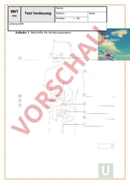 MNT 1em Name: Test Verdauung Datum: Punkte: Note: 64 Unterschrift: Aufgabe 1 Beschrifte die Verdauungsorgane. 11 Aufgabe 2 Zeichne einen Zahn und beschrifte ihn. 11 Aufgabe 3 Nenne die drei Stufen der Verdauung und erkläre in wenigen Worten, was dort passiert. 1. 2. 3. Aufgabe 4 Schon im Mund wird die Nahrung anverdaut. Was passiert, wenn ihr ein Stück Brot möglichst lange kaut? Notiere deine Beobachtung, die wissenschaftliche Erklärung (inkl. Fachbegriffen) und mache eine passende Zeichnung. /6 Beobachtung: Erklärung: Zeichnung /5 Aufgabe 5 Erkläre den Schluckvorgang. a) b) Ordne den Zahlen in Teilbild die richtigen Begriffe zu! Beschreibe den weiteren Transport des Bissens in die Speiseröhre, der in den Teilbildern bis dargestellt ist! 11 Aufgabe 6 Was passiert, wenn man sich verschluckt? Erkläre! /2 Aufgabe 7 Während eines Versuchs habt ihr einen Tennisball durch einen Nylonstrumpf gedrückt. Was hat der Nylonstrumpf dargestellt? Was hat der Tennisball dargestellt? Erkläre den Vorgang möglichst detailliert. /3 Aufgabe 8 Kreuze an, ob die folgenden Aussagen richtig oder falsch sind. richtig falsch Wenn die Zähne aus dem Kiefer wachsen, kann dies schmerzhaft sein. Ein vollständiges Milchgebiss hat je 10 Zähne im Ober- und Unterkiefer. Die letzten Backenzähne werden auch Weisheitszähne genannt. Backenzähne sind breit und zermahlen die Nahrung. Die Vorverdauung im Mund nennt man auch mechanische Verdauung. Bei einer Blinddarmoperation wird der Blinddarm entfernt. Die harte Oberschicht des Zahns nennt sich Zahnkrone. Das Enzym im Speichel heisst Amylase. Atmen während des Schluckens ist möglich. Es dauert ca. 1 Minute bis ein Nahrungsbrocken den Magen erreicht. 10 Frage 1. Welche „Krankheit ist auf der Antwort Welt am meisten verbreitet? 2. Wie lang ist unser Dünndarm? 3. Warum haben die meisten FastFood Ketten rote Farbe in ihrem Logo? 4. Wie viel Tonnen Nahrung verdaut der Mensch durchschnittlich in seinem Leben? 5. Wie lang ist der Dickdarm des Menschen? 6. Von wem wird der Schluckvorgang gesteuert? 7. Wie lange bleiben Speisen im Magen? 8. Wie lang ist der Dünndarm eines Rinds? 9. Wie viel Liter Speichel produzieren die Speicheldrüsen pro Tag? 10.Was wird bei einer Blinddarm-OP entfernt? Aufgabe 9 Wähle 5 Fragen aus und beantworte sie. Viel /5