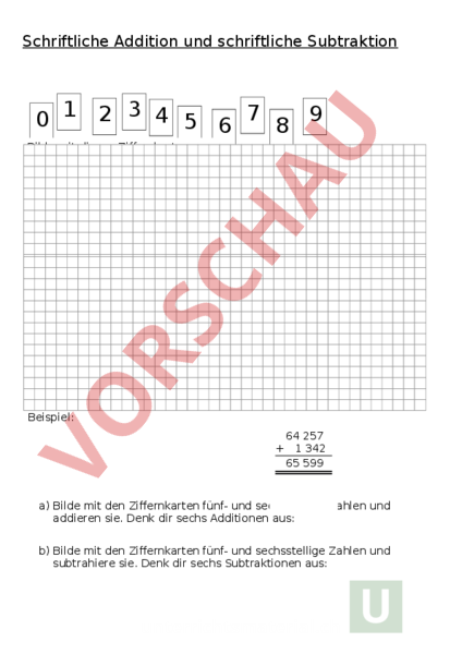 Schriftliche Addition und schriftliche Subtraktion 0 1 2 3 4 5 6 7 8 9 Bilde mit diesen Ziffernkarten1 Zahlen. 6 4 2 5 7 1 1 3 4 2 Beispiel: 64 257 1 342 65 599 a) Bilde mit den Ziffernkarten fünf- und sechsstellige Zahlen und addieren sie. Denk dir sechs Additionen aus: b) Bilde mit den Ziffernkarten fünf- und sechsstellige Zahlen und subtrahiere sie. Denk dir sechs Subtraktionen aus: