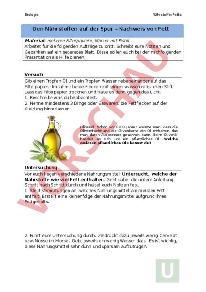 Arbeitsblatt: Nachweis von Fett - Lernaufgabe