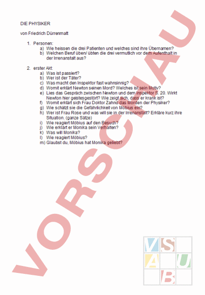 DIE PHYSIKER von Friedrich Dürrenmatt 1. Personen: a) Wie heissen die drei Patienten und welches sind ihre Übernamen? b) Welchen Beruf üben/ übten die drei vermutlich vor dem Aufenthalt in der Irrenanstalt aus? 2. erster Akt: a) Was ist passiert? b) Wer ist der Täter? c) Was macht den Inspektor fast wahnsinnig? d) Womit erklärt Newton seinen Mord? Welches ist sein Motiv? e) Lies das Gespräch zwischen Newton und dem Inspektor S. 20. Wirkt Newton hier geistesgestört? Wie zeigt sich, dass er krank ist? f) Womit erklärt sich Frau Doktor Zahnd das Morden der Physiker? g) Wie schätzt sie die Gefährlichkeit von Möbius ein? h) Wer ist Frau Rose und was will sie in der Irrenanstalt? Erkläre kurz ihre Situation. (ganze Sätze) i) Wie reagiert Möbius auf den Besuch? j) Wie erklärt er Monika sein Verhalten? k) Was will Monika? l) Wie reagiert Möbius? m) Glaubst du, Möbius hat Monika geliebt?