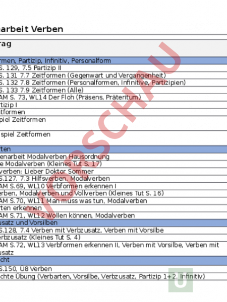 Name: Planarbeit Verben Auftrag Sozialfor Korrek tur Zeitformen, Partizip, Infinitiv, Personalform WdW S. 129, 7.5 Partizip II WdW S. 131 7.7 Zeitformen (Gegenwart und Vergangenheit) WdW S. 132 7.8 Zeitformen (Personalformen, Infinitive, Partizipien) WdW S. 133 7.9 Zeitformen (Alle) WdW AM S. 73, WL14 Der Floh (Präsens, Präteritum) AB Partizip AB Zeitformen Brettspiel Zeitformen Würfelspiel Zeitformen Verbarten Gruppenarbeit Modalverben Hausordnung AB: Die Modalverben (Kleines Tut S. 17) Modalverben: Lieber Doktor Sommer WdW S.127, 7.3 Hilfsverben, Modalverben WdW AM S.69, WL10 Verbformen erkennen Hilfsverben, Modalverben und Vollverben (Kleines Tut S. 16) WdW AM S.70, WL11 Man muss was tun, Modalverben Verbarten erkennen WdW AM S.71, WL12 Wollen können, Modalverben Verbzusatz und Vorsilben WdW S.128, 7.4 Verben mit Verbzusatz, Verben mit Vorsilbe Der Verbzusatz (Kleines Tut S. 4) WdW AM S.72, WL13 Verbformen erkennen II, Verben mit Vorsilbe, Verben mit Verbzusatz Gemischt WdW S.150, Ü8 Verben Gemischte Übung (Verbarten, Vorsilbe, Verbzusatz, Partizip 12, Infinitiv) Du Du Du Du Du Mischol Du Gegensei tig Gegensei tig Mischol Du Mischol Du Du Du Du Du Du Du Du Du Du Du Erledi gt Name: