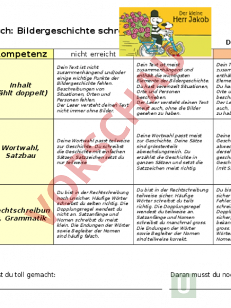 Beurteilungsraster mit den Kriterien Inhalt, Wortschatz und Rechtschreibung/Grammatik zum Schreiben einer Bildergeschichte (Herr Jakob)