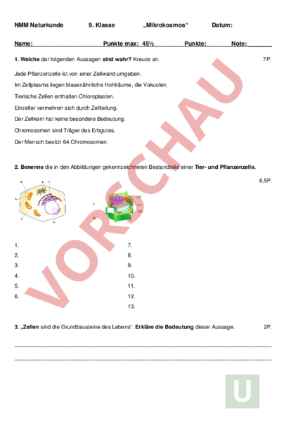 NMM Naturkunde 9. Klasse Name: „Mikrokosmos Punkte max: 45 Punkte: Datum: Note: 1. Welche der folgenden Aussagen sind wahr? Kreuze an. 7P. Jede Pflanzenzelle ist von einer Zellwand umgeben. Im Zellplasma liegen blasenähnliche Hohlräume, die Vakuolen. Tierische Zellen enthalten Chloroplasten. Einzeller vermehren sich durch Zellteilung. Der Zellkern hat keine besondere Bedeutung. Chromosomen sind Träger des Erbgutes. Der Mensch besitzt 64 Chromosomen. 2. Benenne die in den Abbildungen gekennzeichneten Bestandteile einer Tier und Pflanzenzelle. 6,5P. 13. 7. 11. 10. 12. 9. 8. 1. 7. 2. 8. 3. 9. 4. 10. 5. 11. 6. 12. 13. 3. „Zellen sind die Grundbausteine des Lebens. Erkläre die Bedeutung dieser Aussage. 2P. 4. Mit welchem menschlichen Organ, das ähnliche Aufgaben erfüllt, könnte die Wand der Pflanzenzelle verglichen werden? 1P. 5. a) Beschreibe den Vorgang der Zellteilung in eigenen Worten. Achte darauf, dass du alle fünf Phasen der Mitose in deiner Erklärung miteinbaust. 5P. 5. b) Zusatzfrage: Wie heisst die Phase, in der die eigentliche Zellteilung stattfindet? 1P. 6. Erkläre, was die „DNS ist. Deine Erklärung beinhaltet die untenstehenden Begriffe. Code Zellkern Basen Gen 4P. 7. a) Nenne die vier Bausteine der DNS. 2P. b) Beurteile den folgenden DNSStrang nach Korrektheit. Markiere und Begründe Fehler. 2P. G–G–T–T–A–C–A C–A–A–C–T–G–G 8. Was sind Mutationen? Nenne 2 Arten von Mutationen! 3P. 9. Was ist bei Menschen, die unter dem DOWNSyndrom leiden anders, als bei gesunden Menschen (in Bezug zu den Chromosomen)? 2P. 10. Es findet eine Kreuzung zwischen zwei Wellensittichen statt. gelbes Gefieder, Federfarbe dominant W blaues Gefieder, Federfarbe rezessiv a) Erkläre anhand dieses Beispiels die 1. Mendel‘sche Regel. 2P. 8. Benenne die einzelnen Teile des Chromosoms. 4 P. 1 2 3 4 9. Schreibe die Genotypen zu den Blutgruppen auf. Blutgruppe A: Blutgruppe B: Blutgruppe AB: Blutgruppe OO: 4 P. Lösungen 1. Welche der folgenden Aussagen sind wahr? Kreuze an. 7P. Jede Pflanzenzelle ist von einer Zellwand umgeben. Im Zellplasma liegen blasenähnliche Hohlräume, die Vakuolen. Tierische Zellen enthalten Chloroplasten. Einzeller vermehren sich durch Zellteilung. Der Zellkern hat keine besondere Bedeutung. Chromosomen sind Träger des Erbgutes. Pantoffeltierchen ernähren sich von Pflanzenresten. Der Mensch besitzt 64 Chromosomen. 2. Benenne die in den Abbildungen gekennzeichneten Bestandteile einer Tier und Pflanzenzelle. 6,5P. Tierzelle: 1. 2. 3. 4. 5. 6. Zellmembran Zellplasma Zellkern Endoplasmatisches Retikulum Golgi Apparat Mitochondrium Pflanzenzelle: 7. Ribosomen 8. Zellwand 9. Mitochondrium 10. Chloroplast 11. Vakuole 12. Zellmembran 13. Golgiapparat 3. „Zellen sind die Grundbausteine des Lebens. Erkläre die Bedeutung dieser Aussage. 2P. Wenn man geboren wird, dann besteht man aus nur einer einzigen Zelle. Sie ist also der Grundbaustein des Lebens. 4. Mit welchem menschlichen Organ, das ähnliche Aufgaben erfüllt, könnte die Wand der Pflanzenzelle verglichen werden? 1P. Haut 5. a) Beschreibe den Vorgang der Zellteilung in eigenen Worten. Achte darauf, dass du alle fünf Phasen der Mitose erwähnst in deiner Erklärung. 5P. Die Chromosomen verdoppeln sich, ziehen sich zusammen und werden verdickt. In der Prophase lagern sie sich in der Äquatorialebene an. Von beiden Seiten her haften die Spindelfasern des Spindelapparats an die Centromere an. In der Anaphase werden die beiden Schwesterchromatiden getrennt. Die Chromosomen werden an die Zellpolen gezogen. In der Telophase entstehen neue Kernhüllen, die Spindelfasern lösen sich auf. In der Cytokinese werden die Zellorganellen auf die Tochterzellen aufgeteilt. 5. b) Zusatzfrage: Wie heisst die Phase, in der die eigentliche Zellteilung stattfindet? Cytokinese 6. Erkläre, was die „DNS ist. Deine Erklärung beinhaltet die untenstehenden Begriffe. Code Zellkern Basen Gen 4P. Die DNS enthält unsere Erbinformation und ist der Bestandteil der Chromosomen und ist also im Prinzip der Bauplan unseres Körpers. Die Chromosomen sind in unseren Zellkernen. Die DNS ist eine Doppelhelix. Die Chromosomen bestehen aus DNS, auf welcher es bestimmte Abschnitte hat, die als Gene bezeichnet werden. Alle Gene sind aufgebaut aus den verschiedenen Basen. Basen treten wiederum in bestimmten Codes auf, da immer nur Adenin und Thymin sowie Guanin und Cytosin nebeneinander auftauchen können und den DNSCode bilden. 7. a) Nenne die vier Bausteine der DNS. 2P. Phosphor, Zucker, 4 Basen (Guanin, Cytosin, Thymin, Adenin) b) Beurteile den folgenden DNSStrang nach Korrektheit. Markiere und Begründe Fehler. 2P. G–G–T–T–A–C–A C–A–A–C–T–G–G 8. Was sind Mutationen? Nenne 2 Beispiele! 3P. Mutationen sind Veränderungen der DNA, also der Erbinformation. Diese können in einem Gen, einem Allel, einem Chromosom oder in einem ganzen Chromosomensatz auftreten. Genmutation, Chromosomenmutation und Genommutationen. 9. Was ist bei Menschen, die unter dem DOWNSyndrom leiden anders, als bei gesunden Menschen (in Bezug zu den Chromosomen)? 2P. Nicht der ganze Chromosomensatz ist mehrfach vorhanden, sondern nur die Anzahl von einem oder wenigen Chromosomen ist vermindert oder erhöht. Ein Beispiel für eine Aneuploidie ist Trisomie 21: Bei dieser Krankheit ist das 21. Chromosom dreifach vorhanden, was aufgrund von Nondisjunktion geschieht. 10. Es findet eine Kreuzung zwischen zwei Wellensittichen statt. gelbes Gefieder, Federfarbe dominant W blaues Gefieder, Federfarbe rezessiv a) Erkläre anhand dieses Beispiels die 1. Mendel‘sche Regel. 2P. Die 1. mendelsche Regel wird deshalb Uniformitätsregel genannt. Kreuzt man zwei Individuen einer Art, die in einem Merkmal unterschiedlich, aber jeweils reinerbig sind, so sind die Nachkommen in der 1. Tochtergeneration Generation) in diesem Merkmal alle gleich (Uniformitätsgesetz). 8. Benenne die einzelnen Teile des Chromosoms. 1 Chromatid 2 Centromer 3 kurzer Chromosomarm 4