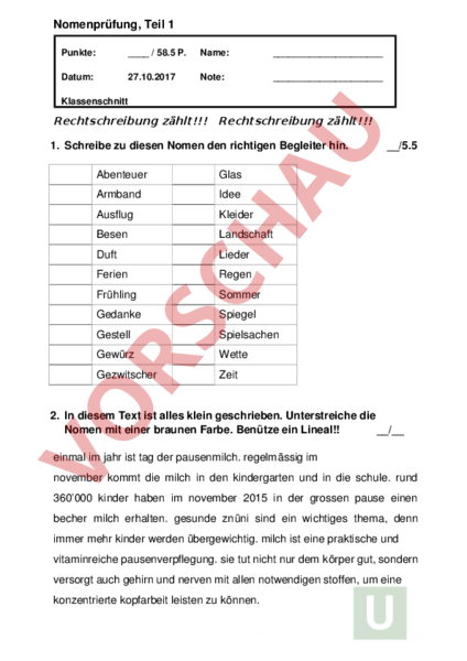 Nomenprüfung, Teil 1 Punkte: 58.5 P. Name: Datum: 27.10.2017 Note: Klassenschnitt Rechtschreibung zählt!!! Rechtschreibung zählt!!! 1. Schreibe zu diesen Nomen den richtigen Begleiter hin. Abenteuer Glas Armband Idee Ausflug Kleider Besen Landschaft Duft Lieder Ferien Regen Frühling Sommer Gedanke Spiegel Gestell Spielsachen Gewürz Wette Gezwitscher Zeit /5.5 2. In diesem Text ist alles klein geschrieben. Unterstreiche die Nomen mit einer braunen Farbe. Benütze ein Lineal!! / einmal im jahr ist tag der pausenmilch. regelmässig im november kommt die milch in den kindergarten und in die schule. rund 360000 kinder haben im november 2015 in der grossen pause einen becher milch erhalten. gesunde znüni sind ein wichtiges thema, denn immer mehr kinder werden übergewichtig. milch ist eine praktische und vitaminreiche pausenverpflegung. sie tut nicht nur dem körper gut, sondern versorgt auch gehirn und nerven mit allen notwendigen stoffen, um eine konzentrierte kopfarbeit leisten zu können. 3. Suche die Nomen, übermale sie braun und schreibe sie mit dem Begleiter auf. / decke gelb spass glatt tafel küche jacke bäcker lecker komisch schön engel stift müde schuhe klein 4. Suche alle Begleiter von Nomen und übermale sie orange. ihrer blau dann zwanzig deines den grün des diese doch dort einem so einmal euer seine ich ihr also mein noch einen rot rund schön für seinem nur /_ unsere vier wieso wo zehn deinem zwei 5. Welcher Begleiter passt in die Lücke? Fülle die Lücken richtig aus. /7 Lange schon steht Peter vor Geisterbahn. der – die – das Soll er Fahrt wagen? ein – eine – einen Wird er sich vor scheusslichen Grimassen und den – dem – des wimmernden Geistern nicht zu sehr fürchten? den – dem – des Schliesslich bittet er Freund Erich mitzukommen. sein – seinen – seinem 2 Die beiden setzen sich in kleines Gefährt. ein – eine – einen Nach Augenblicken beginnt einig – einigen – einigem abenteuerliche Reise. der – die – das Heftig pocht Herz. mein – sein – dein kalte Hand hat Peter berührt. ein – eine – einen Er stösst wilden Schrei aus. ein – eine – einen Von nun an schliesst er Augen. sein – seine seines Plötzlich hört er Nachbar lachen. den – dem – des Fahrt ist zu Ende. der – die – das 6. Bei jedem Wortpaar ist eines der Wörter ein Nomen. Übermale die Nomen braun und schreibe sie mit den Begleitern auf. /4 üben – übung faulheit – faul person – persönlich 7. Suche zu diesen Verben das passende Nomen und schreibe es mit dem /5.5 erlaubnis – erlauben geheim – geheimnis ärger – ärgerlich bäcker – backen hacke – hacken Begleiter auf. springen der Sprung glühen helfen schnallen fliehen lang fischen arbeiten schiessen zeigen fliegen wahr 8. Suche zu diesen Nomen das passende Verb und schreibe es auf. /3.75 3 der Schlaf schlafen der Brand der Traum die Sprache der Koch der Gewinn der Schrei der Forscher der Blitz die Frage die Schrift der Kampf 9. Schreibe zu diesen Nomen den richtigen Begleiter hin. Bank Spitze Butter Thermometer Ecke Wachs Fahne Zehe Ferse Bleistift Foto Käfig Giraffe Kamin Lineal Koffer Null Magnet Radio Mais Schilf Muskel Socke Scheitel Spital Tunnel /6.5 4
