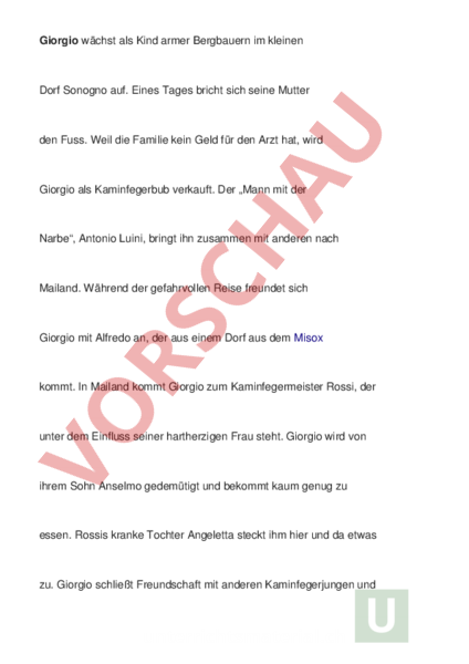 Giorgio wächst als Kind armer Bergbauern im kleinen Dorf Sonogno auf. Eines Tages bricht sich seine Mutter den Fuss. Weil die Familie kein Geld für den Arzt hat, wird Giorgio als Kaminfegerbub verkauft. Der „Mann mit der Narbe, Antonio Luini, bringt ihn zusammen mit anderen nach Mailand. Während der gefahrvollen Reise freundet sich Giorgio mit Alfredo an, der aus einem Dorf aus dem Misox kommt. In Mailand kommt Giorgio zum Kaminfegermeister Rossi, der unter dem Einfluss seiner hartherzigen Frau steht. Giorgio wird von ihrem Sohn Anselmo gedemütigt und bekommt kaum genug zu essen. Rossis kranke Tochter Angeletta steckt ihm hier und da etwas zu. Giorgio schließt Freundschaft mit anderen Kaminfegerjungen und wird in die Gemeinschaft der „Schwarzen Brüder aufgenommen. Zusammen wehren sie sich gegen die Angriffe einer Schar von Mailänder Jungen, den „Wölfen. Giorgios Freund Alfredo stirbt in Mailand an Lungentuberkulose. Bei der Beerdigung versöhnen sich die beiden Gruppen. Später verhelfen die „Wölfe Giorgio und ein paar Freunden zur Flucht zurück in die Schweiz. (Ende)
