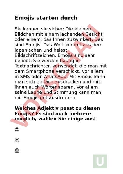 Emojis starten durch Sie kennen sie sicher: Die kleinen Bildchen mit einem lachenden Gesicht oder einem, das Ihnen zuzwinkert. Das sind Emojis. Das Wort kommt aus dem Japanischen und heisst Bildschriftzeichen. Emojis sind sehr beliebt. Sie werden häufig in Textnachrichten verwendet, die man mit dem Smartphone verschickt, vor allem in SMS oder WhatsApp. Mit Emojis kann man sich einfach ausdrücken und mit ihnen auch Wörter sparen. Vor allem seine Laune und Stimmung kann man mit Emojis gut ausdrücken. Welches Adjektiv passt zu diesen Emojis? Es sind auch mehrere möglich, wählen Sie einige aus!