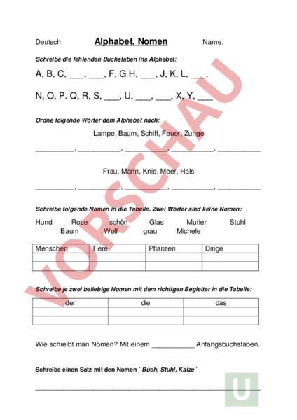 Alphabet, Nomen Deutsch Name: Schreibe die fehlenden Buchstaben ins Alphabet: A, B, C,,, F, H,, J, K, L,, N, O, P. Q, R, S,, U,,, X, Y, Ordne folgende Wörter dem Alphabet nach: Lampe, Baum, Schiff, Feuer, Zunge ,,,, Frau, Mann, Knie, Meer, Hals ,,,, Schreibe folgende Nomen in die Tabelle. Zwei Wörter sind keine Nomen: Hund Rose Baum Menschen schön Wolf Tiere Glas grau Mutter Michele Pflanzen Stuhl Dinge Schreibe je zwei beliebige Nomen mit dem richtigen Begleiter in die Tabelle: der die das Wie schreibt man Nomen? Mit einem Anfangsbuchstaben. Schreibe einen Satz mit den Nomen Buch, Stuhl, Katze