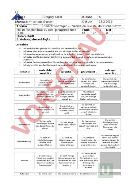 Name Gregory Koller Klasse 6. Fach Deutsch Datum 18.2.2016 Thema Gedicht vortragen – „Weisst du, wie still der Fischer sitzt? Mit 10 Punkten hast du eine genügende Note Punk Not (4,0). te 17 Unterschrift Erziehungsberechtigte Lernziele Ich spreche den ganzen Text deutlich und verständlich vor. Ich setze die Lautstärke gezielt ein, um wichtige Stellen zu betonen. Ich spreche angemessen schnell und variiere deutlich je nach Inhalt des Gedichts. Ich setze die Möglichkeiten der Stimme zielgerichtet ein und erreiche so einen passenden Ausdruck. Ich setze Pausen passend zur Sinneinheit ein, um eine spannungsvolle Wirkung zu erzielen. Ich stehe ruhig vor der Klasse und kann das Gedicht entspannt vortragen. Indikator noch nicht erreicht 0 Artikulation Du sprichst undeutlich und unverständlich. Du sprichst nur wenige Teile deutlich und verständlich aus. Du sprichst den ganzen Text meist deutlich und verständlich aus. Lautstärke Du setzt deine Lautstärke nicht ein, um wichtige Stellen zu betonen. Du setzt deine Lautstärke nur an wenigen Stellen gezielt ein. Du setzt die Lautstärke gezielt ein, um wichtige Stellen zu betonen. Sprechtempo Du sprichst zu schnell/langsam und variierst Du sprichst angemessen schnell, variierst jedoch nicht. Du sprichst angemessen schnell und variierst deutlich je nach Inhalt des Textes. Sprechfluss Du hast viele Stockungen, welche den Sprechfluss sehr stören. Du hast einige Stockungen, welche stören. Du hast wenige Stockungen, die jedoch kaum störend sind. Du sprichst durchwegs flüssig ohne störende Stockungen oder Fehler. Stimmführung Du setzt die Möglichkeiten der Stimme nicht zielgerichtet ein. Du setzt die Möglichkeiten der Stimme kaum zielgerichtet ein. Du setzt die Möglichkeiten der Stimme manchmal zielgerichtet ein. Du setzt die Möglich keiten der Stimme zielgerichtet ein. So erreichst du einen passenden Ausdruck des Inhalts. Pausen Du setzt keine Pausen passend zur Sinneinheit ein. Das Gedicht weist keine Spannung auf. Du setzt wenige Pausen passend zur Sinneinheit ein. Das Gedicht verliert an Spannung. Du setzt Pausen passend zur Sinneinheit ein, um eine spannungsvolle Wirkung oder Stimmung zu erzielen. Auftreten Du wirkst sehr Du wirkst ein wenig Du stehst ruhig vor erreicht 1 gut erreicht 2 sehr gut erreicht 3 Du sprichst den ganzen Text deutlich und durchwegs verständlich aus. nervös und trägst das Gedicht entsprechend vor. nervös, trägst jedoch das Gedicht entspannt vor. der Klasse und trägst das Gedicht entspannt vor.