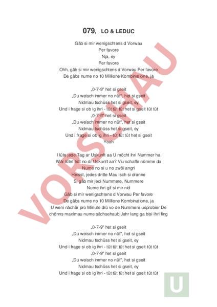 079, LO LEDUC Gäb si mir wenigschtens Vorwau Per favore Nja, ey Per favore Ohh, gäb si mir wenigschtens Vorwau Per favore De gäbs nume no 10 Millione Kombinatione, ja „079 het si gseit „Du weisch immer no nüt, het si gseit Nidmau tschüss het si gseit, ey Und frage si ob ig ihri tüt tüt tüt het si gseit tüt tüt „079 het si gseit „Du weisch immer no nüt, het si gseit Nidmau tschüss het si gseit, ey Und frage si ob ig ihri tüt tüt tüt het si gseit Yeah lüte jede Tag ar Uskunft aa möcht ihri Nummer ha Wär lütet hüt no dr Uskunft aa? Viu schaffe nümme da Nume no si no zwöi angri Heisst, jedes dritte Mau isch si dranne Si gäb mir jedi Nummere, Nummere Nume ihri git si mir nid Gäb si mir wenigschtens Vorwau Per favore De gäbs nume no 10 Millione Kombinatione, ja weni nächär pro Minute drü vo de Nummere usprobier De chönns maximau nume sächsehaub Jahr lang ga bisi ihri fing „079 het si gseit „Du weisch immer no nüt, het si gseit Nidmau tschüss het si gseit, ey Und frage si ob ig ihri tüt tüt tüt het si gseit tüt tüt „079 het si gseit „Du weisch immer no nüt, het si gseit Nidmau tschüss het si gseit, ey Und frage si ob ig ihri tüt tüt tüt het si gseit tüt tüt Und jitz bini sit Jahre Immer fautsch verbunde Und am Schluss blibt mir tatsächlich numen Nummre, nume no ei Nummre woni die ytipp mit zittrige Finger Und mir sicher bi das die doch muess stimme Ghöri plötzlech das öbber drann isch wäge däm ghöri das Tram nid Wo no het wöue brämsen aber es längt lang nid Es renne Lüüt hären aus verlangsamt sich „144 hei si gseit „Wie isch das nume passiert?, hei si gseit „Huere Siech, hei si gseit, ja si winke Ambulanz häre, „Hie hie hie hei si gseit „hie hie „144 hei si gseit „Wie isch das nume passiert?, hei si gseit „Huere Siech, hei si gseit, ja si winke Ambulanz häre, „Hie hie hie hei si gseit „hie hie