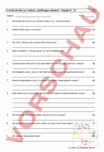 Lernkontrolle zur Lektüre „Rolltreppe abwärts, Kapitel 8 12 Name: 1. 32 Note: Wie heisst der Freund von Jochens Mutter (Vor- und Nachname)? (2) 2. Welche Pläne hat er mit Jochen? (1) 3. Wer ist Dr. Gernau und welchen Beruf übt er aus? (2) 4. Was will dieser Dr. Gernau genau von der Anstaltsleitung? (1) 5. Jochens Mutter besucht ihn und übermittelt ihm eine freudige Nachricht. Welche? (1) 6. Wer begleitet Jochen, als er in der Stadt einkaufen muss (genaue Bezeichnung!)? (2) 7. Welche Gegenstände (mind. 4) müssen für diesen Anlass gekauft werden? (2) 8. Was unternimmt Jochen alles, damit er nicht an diesem Anlass teilnehmen muss? (3) 9. Wie heisst die Krankenschwester, die sich um ihn kümmert? (1) 10. Wie ist das Verhältnis zwischen Jochen und dem Freund der Mutter? (1) 11. Wie denkt er über seine Mutter? (2) D7Lesen_T2_Rolltreppe abwärts 12. Was hat Herr Katz für die Jungen des Heims für eine Überraschung vorbereitet? (1) 13. Wie erlebt Jochen das Ende dieses Anlasses? (1) 14. Jochens Freund Sven verlässt das Heim. Wohin geht er und was kann er erlernen? (2) 15. Welche Dummheit begehen Sven und Jochen? (2) 16. Welche beiden Konsequenzen hat dieser Vorfall am Ende auch noch für Jochen? (2) 17. Jochen reisst aus. Welche Lüge benutzt er unterwegs, um weiterzukommen? (1) 18. Wie reagiert Jochens Vater, als sein Sohn ihn besucht? (1) 19. In welcher Stadt wohnt Jochens Vater? (1) 20. Den Zimmerkameraden fällt auf, dass Jochen sich nach der Rückkehr verändert hat. Wie ist er jetzt? (3) D7Lesen_T2_Rolltreppe abwärts