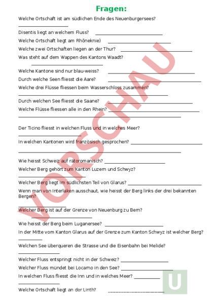Fragen: Welche Ortschaft ist am südlichen Ende des Neuenburgersees? Disentis liegt an welchem Fluss? Welche Ortschaft liegt am Rhôneknie) Welche zwei Ortschaften liegen an der Thur? Was steht auf dem Wappen des Kantons Waadt? Welche Kantone sind nur blau-weiss? Durch welche Seen fliesst die Aare? Welche drei Flüsse fliessen beim Wasserschloss zusammen? Durch welchen See fliesst die Saane? Welche Flüsse fliessen alle in den Rhein? Der Ticino fliesst in welchen Fluss und in welches Meer? In welchen Kantonen wird französisch gesprochen? Wie heisst Schweiz auf rätoromanisch? Welcher Berg gehört zum Kanton Luzern und Schwyz? Welcher Berg liegt im südlichsten Teil von Glarus? Wenn man von Interlaken ausschaut, wie heisst der Berg links der drei bekannten Bergen? Welcher Berg ist auf der Grenze von Neuenburg zu Bern? Wie heisst der Berg beim Luganersee? In der Mitte vom Kanton Glarus auf der Grenze zum Kanton Schwyz ist welcher Berg? Welchen See überqueren die Strasse und die Eisenbahn bei Melide? Welcher Fluss entspringt nicht in der Schweiz? Welcher Fluss mündet bei Locarno in den See? In welchen Fluss fliesst die Inn und in welches Meer? Welche Ortschaft liegt an der Linth? Wie heisst der wohl bekannteste Berg in der Schweiz? In welchem Kanton entspringt die Reuss? Welcher Fluss fliesst in den Ticino? Zähle alle Kantone auf, durch die der Rhein fliesst.