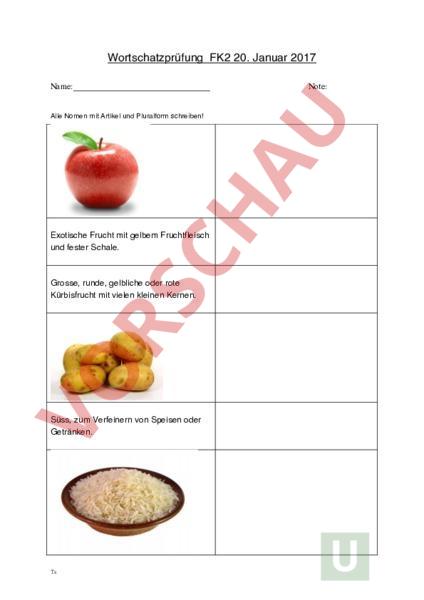 Wortschatzprüfung FK2 20. Januar 2017 Name: Alle Nomen mit Artikel und Pluralform schreiben! Exotische Frucht mit gelbem Fruchtfleisch und fester Schale. Grosse, runde, gelbliche oder rote Kürbisfrucht mit vielen kleinen Kernen. Süss, zum Verfeinern von Speisen oder Getränken. Ts Note: Nahrungsmittel, Gebäck aus Getreide, Wasser und Mehl. flüssiges, fettiges Produkt aus Milch, süss oder sauer, in der Schweiz Rahm weisses, ovales Nahrungsmittel vom Huhn längliche Rolle aus Fleisch und Gewürzen Ts süsse Masse, die von Bienen gemacht wird süsser Brotaufstrich aus Früchten, in der Schweiz Konfitüre weisse, trinkbare Flüssigkeit, meistens von der Kuh, auch von Schafen oder Ziegen dünnes, gerolltes Papier, mit Tabak gefüllt, das man raucht langes, hartes, oranges Gemüse, in der Schweiz Rüebli Ts