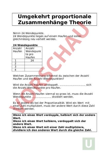 Umgekehrt proportionale Zusammenhänge Theorie Nimm 24 Wendepunkte. 24 Wendepunkte liegen auf einem Haufen und sollen gleichmässig neu verteilt werden. 24 Wendepunkte Anzahl Anzahl Haufen Wendepunk te pro Haufen 1 24 2 3 4 Welchen Zusammenhang erkennst du zwischen der Anzahl Haufen und der Anzahl Wendepunkten? Wird die Anzahl Haufen verdoppelt, sich die Anzahl Wendepunkte pro Haufen. Wenn die Anzahl Haufen viermal so gross ist, muss die Anzahl Wendepunkte dividiert werden. Es ist anders als bei der Proportionalität. Wird ein Wert mit einer Zahl multipliziert, muss der andere Wert durch diese Zahl dividiert werden. Wenn ich einen Wert verdopple, halbiert sich der andere Wert. Wenn ich einen Wert halbiere, verdoppelt sich der andere Wert. Wenn ich einen Wert mit einer Zahl multipliziere, dividiere ich den anderen Wert durch die gleiche Zahl.