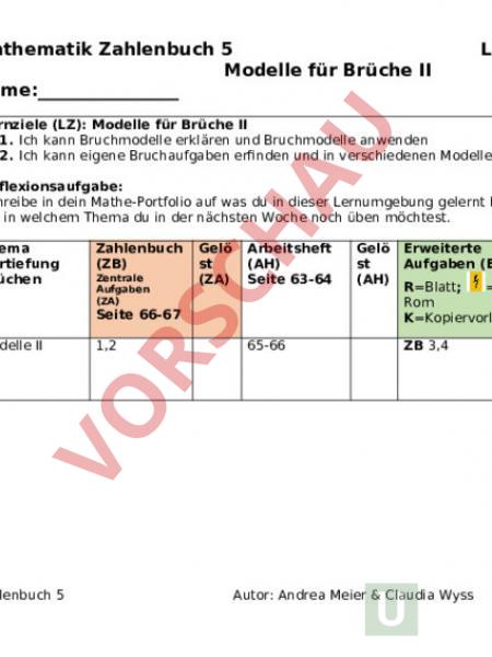 Mathematik Zahlenbuch 5 Modelle für Brüche II Name: Lernumgebung 19 Lernziele (LZ): Modelle für Brüche II 1. Ich kann Bruchmodelle erklären und Bruchmodelle anwenden 2. Ich kann eigene Bruchaufgaben erfinden und in verschiedenen Modellen darstellen Reflexionsaufgabe: Schreibe in dein Mathe-Portfolio auf was du in dieser Lernumgebung gelernt hast. Überlege dir falls es notwendig ist, in welchem Thema du in der nächsten Woche noch üben möchtest. Thema Vertiefung Brüchen Zahlenbuch (ZB) Zentrale Aufgaben (ZA) Gelö st (ZA) Arbeitsheft (AH) Seite 63-64 Seite 66-67 Modelle II Zahlenbuch 5 1,2 65-66 Gelö st (AH) Erweiterte Aufgaben (EA) RBlatt; CD Rom KKopiervorlage Gelö st (EA) Visu LP ZB 3,4 Autor: Andrea Meier Claudia Wyss Februar 2018