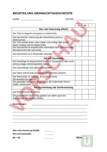 BEURTEILUNG WEIHNACHTSGESCHICHTE NAME: DATUM: /- Idee und Umsetzung (Inhalt) Der Titel ist originell und passt zur Geschichte. Die Geschichte Stimmung der Geschichte passt zu Weihnachten. Der Text enthält einen roten Faden und verfügt über einen klaren Anfang und ein klares Ende. Die Geschichte ist originell oder interessant oder spannend oder überraschend oder kurzweilig Die Geschichte ist in Abschnitte unterteilt. Stil und Grammatik Die Satzlänge ist ansprechend (nicht nur Hauptsätze, aber auch nicht zu lange und komplizierte Sätze). Die Satzanfänge sind abwechslungsreich. Die Sätze sind korrekt aufgebaut und teilweise poetisch. Der Wortschatz ist vielfältig. Es kommen keine Wortwiederholungen vor. Die gewählte Zeit wurde eingehalten, die Grammatik stimmt (Fälle, Verbfomen). Rechtschreibung und Zeichensetzung Die Rechtschreibung stimmt. Die Satzzeichen sind richtig gesetzt (vor allem auch die Satzzeichen der direkten Rede). Bemerkungen: Idee und Umsetzung (Inhalt): Stil und Grammatik: RS SZ: Note: