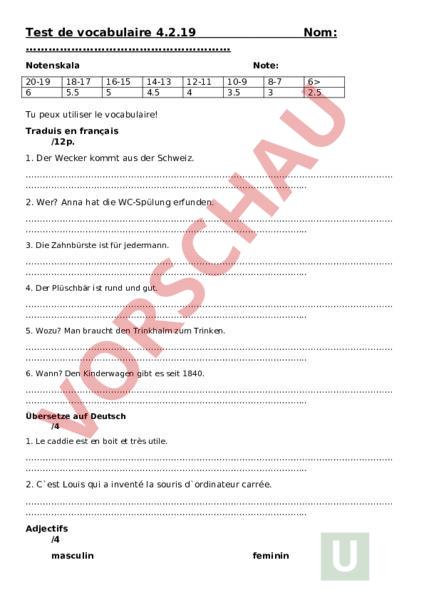 Test de vocabulaire 4.2.19 Notenskala 20-19 6 18-17 5.5 Nom: Note: 16-15 5 14-13 4.5 12-11 4 10-9 3.5 8-7 3 6 2.5 Tu peux utiliser le vocabulaire! Traduis en français /12p. 1. Der Wecker kommt aus der Schweiz. 2. Wer? Anna hat die WC-Spülung erfunden. 3. Die Zahnbürste ist für jedermann. 4. Der Plüschbär ist rund und gut. 5. Wozu? Man braucht den Trinkhalm zum Trinken. 6. Wann? Den Kinderwagen gibt es seit 1840. Übersetze auf Deutsch /4 1. Le caddie est en boit et très utile. 2. Cest Louis qui inventé la souris dordinateur carrée. Adjectifs /4 masculin feminin Le dessin est magique La foto est . Le livre est La casette est bonne Lobjet est La nuit est noire. . Le nutella est délicieux. La paille est .