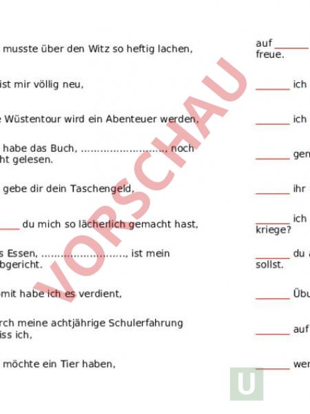 Ich musste über den Witz so heftig lachen, auf ich mich schon seit Jahren freue. Es ist mir völlig neu, ich gekocht habe Die Wüstentour wird ein Abenteuer werden, ich vom Hocker gefallen bin. Ich habe das Buch, , noch nicht gelesen. genauso verspielt ist wie ich. Ich gebe dir dein Taschengeld, ihr umgezogen seid. du mich so lächerlich gemacht hast, ich immer die blödesten Lehrer kriege? Das Essen, , ist mein Leibgericht. du aber nicht gleich ausgeben sollst. Womit habe ich es verdient, Übung den Meister macht. Durch meine achtjährige Schulerfahrung weiss ich, auf meinem Nachttisch liegt Ich möchte ein Tier haben, werde ich dir nie vergessen.