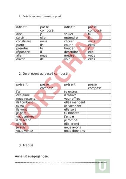 1. Ecris le verbe au passé composé infinitif dire sortir construire partir prendre répondre aller ouvrir passé composé j‘ elle nous ils tu il nous ils infinitif saluer entendre choisir courir bouger desendre mettre voir passé composé tu il vous elles j‘ elle vous elles 2. Du présent au passé composé présent passé composé jai elle aime nous restons ils tombent tu va ils vont je pars vous arrivez il descend elle dit je suis vous venez présent passé composé tu entres il trouve vour offrez elles mangent ils viennent elle sort tu montes j‘entre je tombe elle prend nous avons nous donnons 3. Traduis Anna ist ausgegangen. Wir haben erzählt. Sie ist gerannt. Du hast gesagt. Pierre et Paul sind angekommen. Ich bin gewesen. Er hat konstruiert. Ihr habt gesungen. Er hat gehabt.