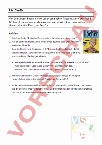 Die Chefin Vor dem „Boss haben alle im Lager ganz schön Respekt. Doch erst auf S. 86 taucht dieser zum ersten Mal auf, und es wird klar, dass in Camp Green Lake eine Frau „der Boss ist. Aufträge: 1. Wie könnte die Chefin des Camps zu ihrer Aufgabe gekommen sein? 2. Gleich bei ihrem ersten Auftritt wird schnell deutlich, dass die Chefin ein wirklicher „Boss ist. Lest die Szene (vom Beginn der S. 87 bis zum Ende von Kapitel 14) mit verteilten Rollen. Danach könnt ihr versuchen, die Szene noch einmal frei nachzuspielen; überlegt gemeinsam: wie sprechen die einzelnen Personen, und wie sieht ihre Gestik und Mimik aus? Wer hat in dieser Szene „das Sagen? Woran merkt man das? Wie übt die Chefin ansonsten Macht aus? (siehe Kapitel 14 15) 3. Mit dem Auftreten der Chefin verändert sich plötzlich einiges im Alltag der Jugendlichen. Was ordnet sie an? Was ist der Grund dafür? 4. In den letzten beiden Absätzen von Kapitel 15 wird deutlich, dass Stanley mehr weiss als die anderen. Was vermutet er wohl? Und du? Bist du auch bereits dem Geheimnis auf der Spur? Schreibe deine eigene Vermutung auf: