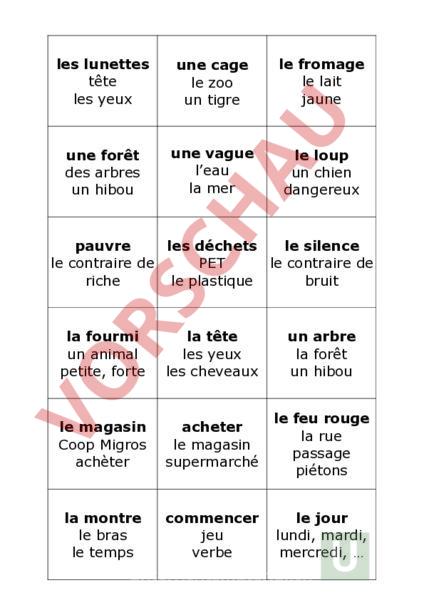 les lunettes tête les yeux une cage le zoo un tigre le fromage le lait jaune une forêt des arbres un hibou une vague leau la mer le loup un chien dangereux pauvre les déchets le silence le contraire de PET le contraire de riche le plastique bruit la fourmi un animal petite, forte la tête les yeux les cheveaux un arbre la forêt un hibou le magasin Coop Migros achèter acheter le magasin supermarché le feu rouge la rue passage piétons la montre le bras le temps commencer jeu verbe le jour lundi, mardi, mercredi, le dentifrice la brosse à dents blanc la brosse à dents le dentifrice le réveil le matin sonner le mouchoir le rhume blanc le caddie le magasin 2.- une allumette le feu la paille boire le sirop la poussette le bébé marcher un ours un animal dangereux la souris un animal gris une invention une machine un rêve dormir les images les vacances le nom pas décole Fritz, Amélie le pain manger le boulanger petit grand le contraire de le contraire de grand petit une larme triste crier