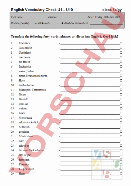 English Vocabulary Check U1 – U10 class 1a/gy First name: surname . date Friday, 30th June 2006 Credits (Punkte): . of 40 mark: . elterliche Unterschrift: Translate the following forty words, phrases or idioms into English. Good luck! 1 Frühstück 2 Auto fahren 3 Nordirland 4 drei Leute 5 Ski fahren 6 Imbissecke 7 weiss (Farbe) 8 einem Freund telefonieren 9 Hose 10 Aschenbecher 11 Schauspiel, Theaterstück 12 fliegen 13 Bleistift 14 jenes ist 15 weinen 16 heute 17 Wörterbuch 18 selbstverständlich 19 Mittwoch 20 probieren 21 Musik hören 22 oder 23 schreiben 24 bei einer Bank arbeiten 25 Das ist gut. 26 fernsehen 27 Ehemann 28 £ 7 pro Billett 29 Haare 30 Kuss 31 Frauen 32 Stammbaum 33 jetzt 34 die Zeitung lesen 35 Velo fahren 36 Schule 37 Es tut mir Leid. 38 der erste Tag 39 Was ist das? 40 langsam
