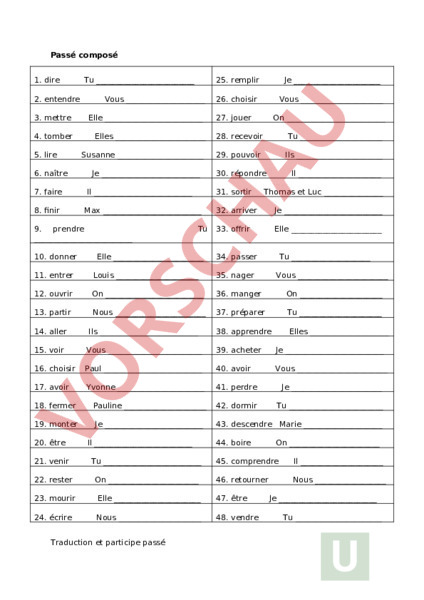 Passé composé 1. dire 2. entendre 3. mettre 4. tomber 5. lire 6. naître 7. faire 8. finir Tu Vous Elle Elles Susanne Je Il 10. donner Je 26. choisir Vous 27. jouer Tu Elle On 28. recevoir Tu 29. pouvoir Ils 30. répondre 31. sortir Max 9. prendre 25. remplir Il Thomas et Luc 32. arriver Je 33. offrir Elle 34. passer Tu 11. entrer Louis 35. nager Vous 12. ouvrir On 36. manger On 13. partir Nous 37. préparer Tu Elles 14. aller Ils 38. apprendre 15. voir Vous 39. acheter Je 16. choisir Paul 40. avoir Vous 17. avoir Yvonne 41. perdre Je Tu 18. fermer Pauline 42. dormir 19. monter Je 43. descendre Marie 20. être Il 44. boire 21. venir Tu 22. rester On 23. mourir Elle 47. être 24. écrire Nous 48. vendre Traduction et participe passé On 45. comprendre Il 46. retourner Nous Je Tu infinitiv dire entendre mettre tomber lire naître faire finir prendre donner entrer ouvrir partir aller voir choisir avoir fermer monter être venir rester mourir écrire remplir choisir jouer recevoir pouvoir répondre sortir arriver offrir passer traduction participe passé (papa) nager manger préparer apprendre acheter perdre dormir descendre boire comprendre retourner vendre